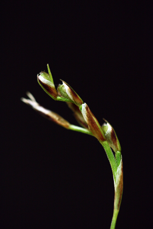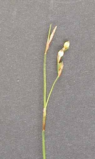 【同定のカギ】針葉樹林内に生える多年草で、有花茎は細い。苞葉は鱗片状で鞘は赤褐色。雌小穂は、果胞をまばらに2〜5個付け、柄が長く下垂することが多い。果胞は短毛が有り、基部の長い付属体が付く。柱頭は3岐。【国内分布】北海道(北見、阿寒)。【国外分布】朝鮮、東北中国、ウスリー。 【ノート】日本では北海道の阿寒等の限られた場所に見られる。小穂はまばらに果胞を付け、苞葉が鱗片状で赤みがかっている。また、雌鱗片が果胞の基部をまいていて、ヒカゲスゲ節の中でも特徴的である。