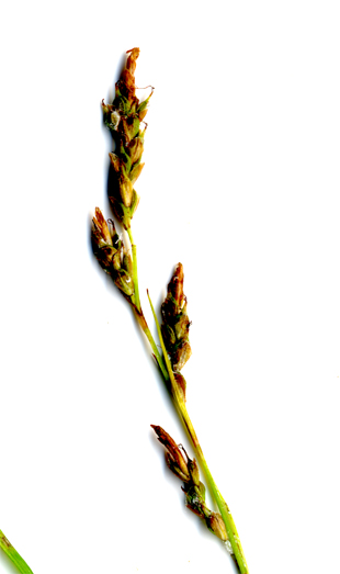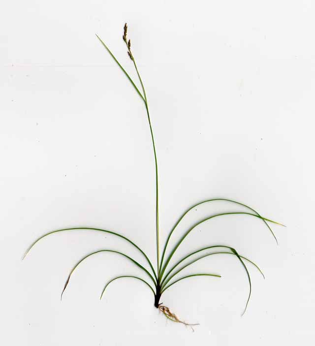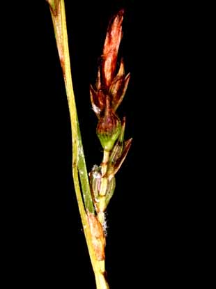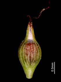 】根県は短く叢生する。小穂は雄雌性で、節に通常1個のみつける。雌鱗片は果胞より少し短い。果胞は無毛で嘴は短い。柱頭は2岐。