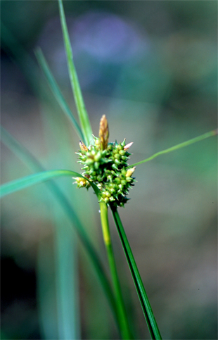 湿地に見られる多年草で、密に叢生する。小穂は有花茎の上に集まり、柄はない。果胞は、雌鱗片より長く、平滑、嘴はやや長く、口部は2歯。柱頭は3岐。