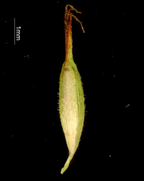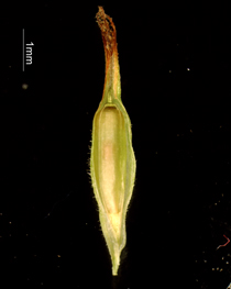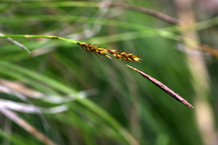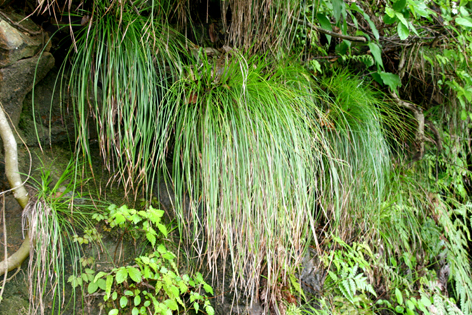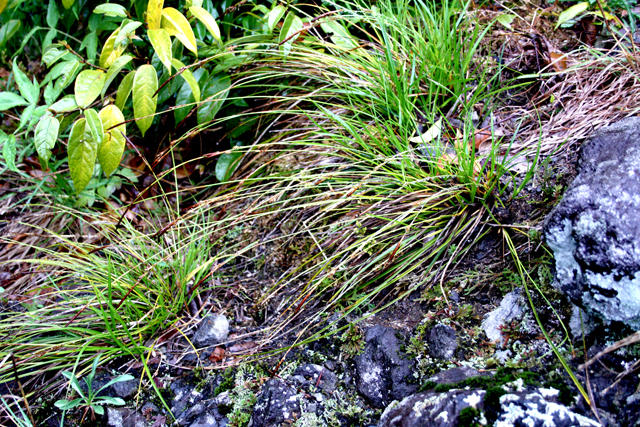 【同定のカギ】渓谷や川岸の岩上に生える多年草で、密に叢生する。基部の鞘は黒褐色で繊維状に細裂する。雄小穂は長く、線柱形。果胞は雌鱗片より長く、披針形、基部に短柄、密に短毛、長嘴、上部は褐色、口部は鋭2歯−2又となる。柱頭は3岐。【国内分布】四国、九州。日本固有。 【ノート】四国と九州の川岸の湿った岩場に広く分布し、大株となる。ソハヤキ (蘇速紀) 要素の分類群と考えられる。コイワカンスゲやミヤマイワスゲに似るが、雄小穂が長く黒褐色。