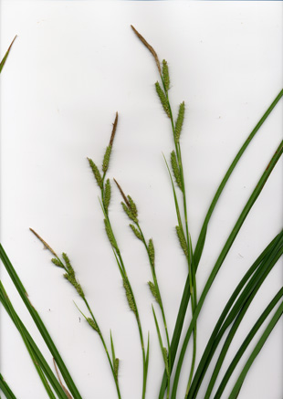 【ノート】ウミノサチスゲは、Tuyama(1938)により南硫黄島から報告された。セキモンスゲに似るが、葉の幅が広く、果胞は、熟すと痩果を緩く包む、幅が1.5〜2mmと広い。キノクニスゲとは果胞の幅が狭く、雌鱗片が果胞と同長または長いかで異なる。Carex augustini Tuyama 【国内分布】小笠原諸島、硫黄諸島。日本固有 【同定のカギ】湿った林床に密に叢生する。基部の鞘は淡褐色、古くなると繊維状に細裂。葉の幅は6〜18mm、硬く,滑らか。果胞は長さ4.5〜5.5mm、幅1.5〜2mm、太い脈があり、無毛、鱗片とほぼ同長。痩果は緩く果胞に包まれ、花柱基部は膨らむ。柱頭は2〜3岐。 写真は、2007年南硫黄島調査隊が持ち帰ったものを、神奈川県湯河原町で栽培し開花結実させたもの。勝山輝男氏による。