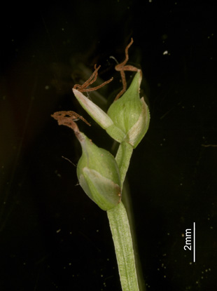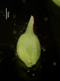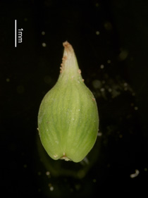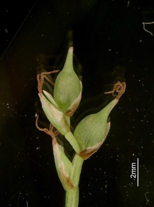 【同定のカギ】山地のシイ・カシ帯−ブナ帯の樹林内に生える多年草で、草丈が短い。有花茎は、高さ10〜20 cm、平滑、軟質。頂小穂は雄性で短い、2〜3個の果胞が続く。果胞は、小型で、雌鱗片より長く、稜間に脈があり、無毛、嘴は長い。柱頭は3岐。【国内分布】四国、九州。日本固有。 【ノート】ヒメジュズスゲは、タマツリスゲに似るが、植物体や雄小穂、果胞が小さいことで区別する。
