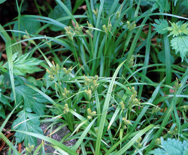 林床や林縁に見られる多年草で、細長い匐枝がある。小穂は、有花茎の上部に集まる。頂小穂は、雄性で柄は無い。果胞は、雌鱗片より長く、わずかに反転し、稜間に5−6脈あり、平滑、嘴は長く、口部は2歯