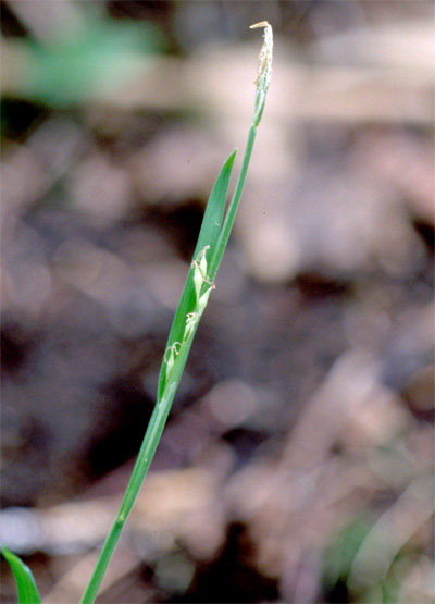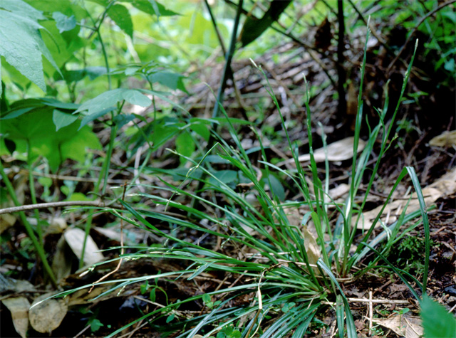 【同定のカギ】山地の樹林内や湿った草地に生える多年草で、叢生する。葉は、幅が6〜12mm、平滑で前年の葉が残る。基部の鞘は赤紫色。頂小穂は、雄性で長い柄がある。側小穂は、雌性で長い柄があり下垂する。果胞は、雌鱗片より長く、稜間に脈があり、無毛、長嘴、口部は斜切形。柱頭は3岐。Carex arakiana (Ohwi) Ohwi 【国内分布】本州(中国地方の日本海側−北陸地方)。日本固有。 【ノート】ヒロハノオオタマツリスゲは、日本海側に分布し、大型で、葉は幅が広く、前年度の葉が次の年まで残ることとが特徴である。