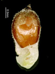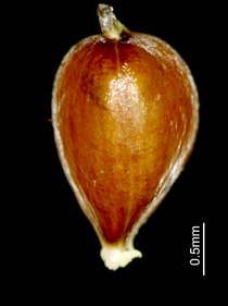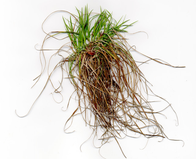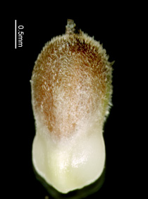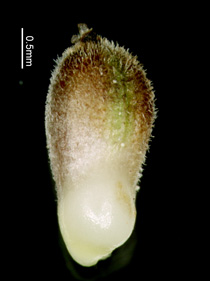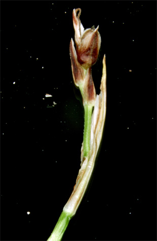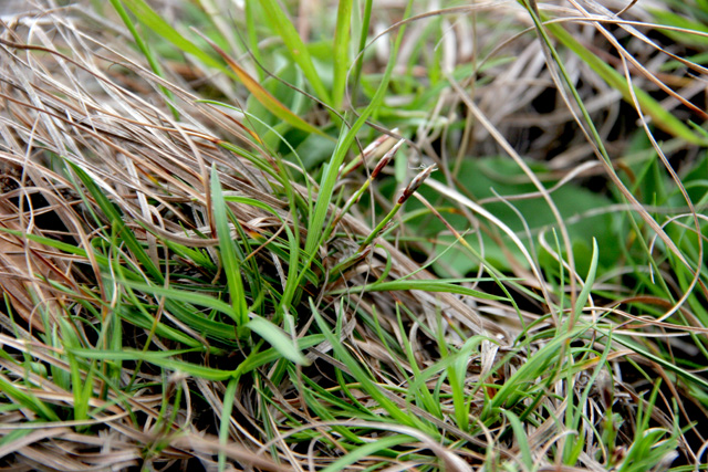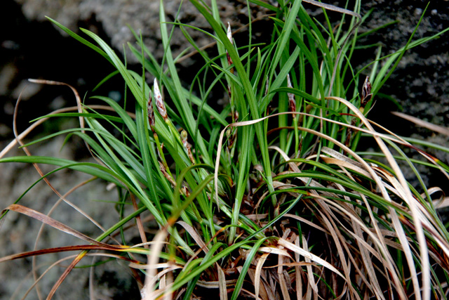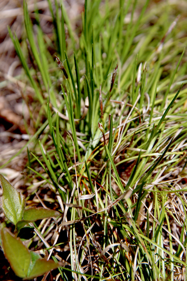【同定のカギ】乾いた明るい樹林内や岩場に叢生。有花茎は、葉よりも特に短く根元に隠れる。基部の鞘は、赤褐色。頂小穂は雄性で、短く線柱形。雌小穂は、小さく果胞を1〜3個付ける。鱗片は赤褐色。果胞は、雌鱗片より短く、不明瞭な細脈、密毛、短嘴、口部は全縁、基部は海綿状の柄がある。柱頭は3岐。Carex humilis Leyss. var. nana (H.Lev. et Vaniot) Ohwi 【国内分布】北海道、本州、四国、九州、対馬。【国外分布】北東アジアに広く分布。 【ノート】ホソバヒカゲスゲは、果実が熟しても花茎は大変短く、株の基部に埋もれるように隠れる。