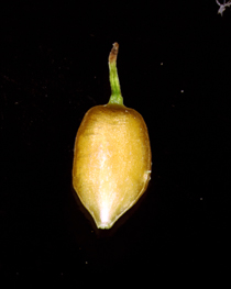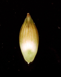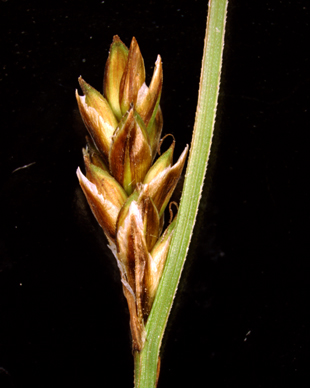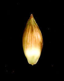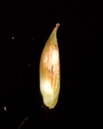 雌小穂、果胞は鱗片とほぼ同長 雌鱗片は淡褐色で鋭頭