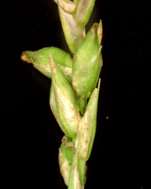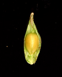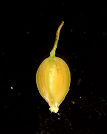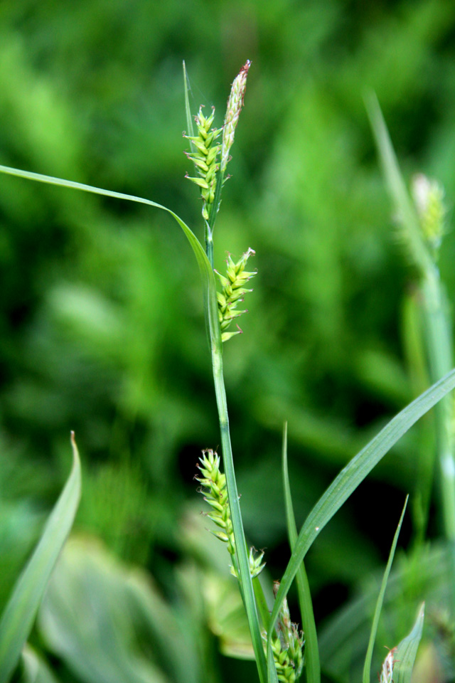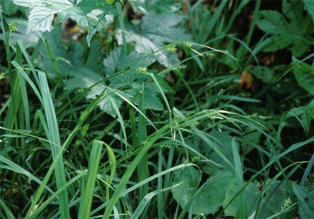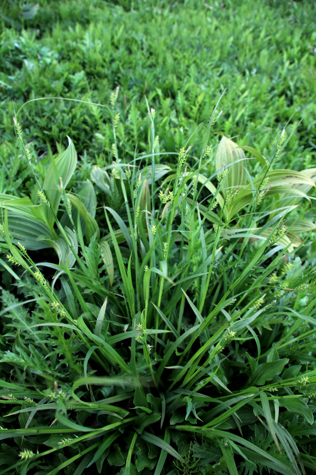 【同定のカギ】山地の湿った樹林内や湿地に生える多年草で、叢生する。葉はコジュズスゲより幅が広く、鮮緑色。果胞は、雌鱗片より長く、熟すと開出し、稜間に脈があり、無毛、長嘴、口部は斜切形。柱頭は3岐。Carex parciflora Boott 【国内分布】北海道、本州(東北地方−山陰地方までの日本海側)。【国外分布】サハリン、千島。 【ノート】グレーンスゲは、コジュズスゲと似ているが、葉の幅が広く、白みがかった緑色でなく鮮緑色であり、雌小穂が大きいことで異なる。 グレーンスゲ 広島県吾妻山 2012年6月2日 ![]()