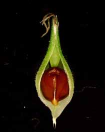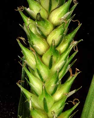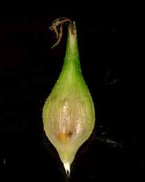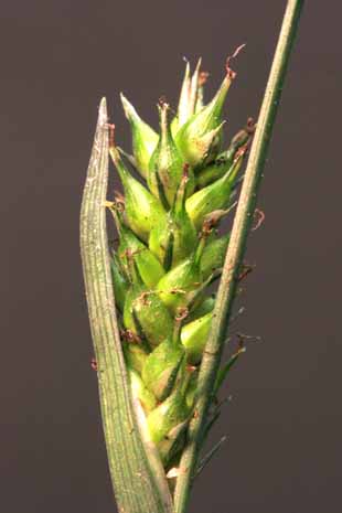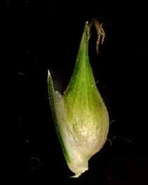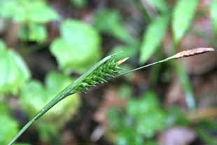 【同定のカギ】日当たりの良い林縁に生え、全体は無毛。有花茎は、乳頭状突起を密布。基部の鞘は、帯茶色、脈は帯褐色、繊維状に細裂。雌鱗片は、蒼白色、軟毛を疎布、鋭頭または短芒。果胞は、鱗片より超出、卵形、熟すと開出、無毛ときに疎に有毛、長嘴となり、口部は2歯。痩果は、密に果胞に包まれ、稜中央部はくびれ、頂部に湾曲した柱状付属体がある。柱頭は3岐。Carex kagoshimensis Tak.Shimizu 【国内分布】本州(山口県)、九州(鹿児島県)。 【ノート】カゴシマスゲはオオムギスゲに似るが、植物体に毛がないこと、葉の幅が1 cm近くなることで異なる。