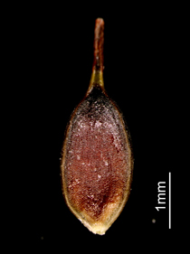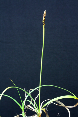 【同定のカギ】高山の岩礫地に生える多年草で横走する根茎があり、疎生する。花序は1個で雄雌性、頂部は雄花、基部は雌花となる。果胞は、雌鱗片とほぼ同長、長倒卵形、背面に5−7脈があり、無毛、嘴はほとんどなく、口部は全縁。痩果は、果胞にゆるく包まれ、花柱が残る。柱頭は3岐。Carex rupestris All. 【国内分布】北海道(夕張山地、日高幌尻岳)、本州(南アルプス仙丈岳、北アルプス雪倉岳)。【国外分布】朝鮮、サハリン、東シベリア。 【ノート】カラフトイワスゲは、日本では分布域が限られていて貴重な種である。花序は1個で、上部に雄花、下部に雌花をつける。