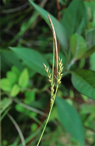 林床や林縁に生え、疎らに叢生し、短い匐枝がある。植物体全体に軟毛を密布する。果胞は、雌鱗片より長く、密毛、短嘴、口部は2小歯。柱頭は3岐。