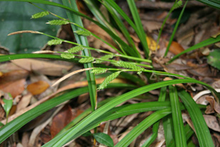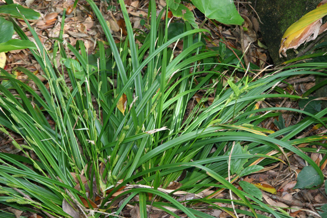 【同定のカギ】海岸近くの林床や林縁および川沿いの陰地に生える多年草で、密に叢生して大株となる。果胞は、鱗片より超出し、熟すと開出し、稜間に7−10の太脈があり、無毛、厚いが軟質、上部は急に狭まって嘴となる。痩果は、上部に環状付属体。柱頭は2岐、まれに3岐。【国内分布】本州(北陸・三河湾以西)、四国、九州、トカラ列島、伊豆諸島(利島)。【国外分布】韓国 (済州島、鬱稜島)。 【ノート】太平洋沿岸の林床、林縁に分布しており、島嶼部でよく見られる。大株となり、果胞が密につき、それらが白みがかって見えることで他の種と区別できる。また、セキモンスゲとは果胞が長卵形で長いことかで分けられる。和名「キノクニスゲ」は紀伊半島で初めに発見されたことによる。