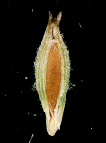 小穂の柄、ざらつく 果胞、短い軟毛 果胞、口部は2歯で開出