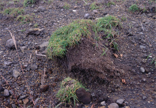 【同定のカギ】山地の草原や岩場、火山裸地に生える多年草で、叢生し匐枝がある。火山裸地ではマット状に分布し、岩場では、盛り上がった塊となる。果胞は、雌鱗片より超出し、微脈、疎らに短毛、基部に短柄、長嘴、口部は浅い2歯。柱頭は3岐。【国内分布】四国、九州。日本固有。 【ノート】九州地方の火山裸地、四国地方では石鎚山や立石山標高1,000 m前後の山地岩場に点在。ミヤマイワスゲに似るが、果胞の長さが4.3−4.5 mmと短く(ミヤマイワスゲは5.6−5.8 mm)、嘴が長く口部が浅い2歯となる。