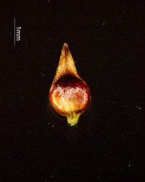果胞、厚膜質、基部は海綿状に膨らむ 口部の両側に細鋸歯がある。