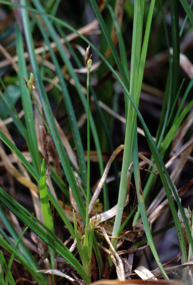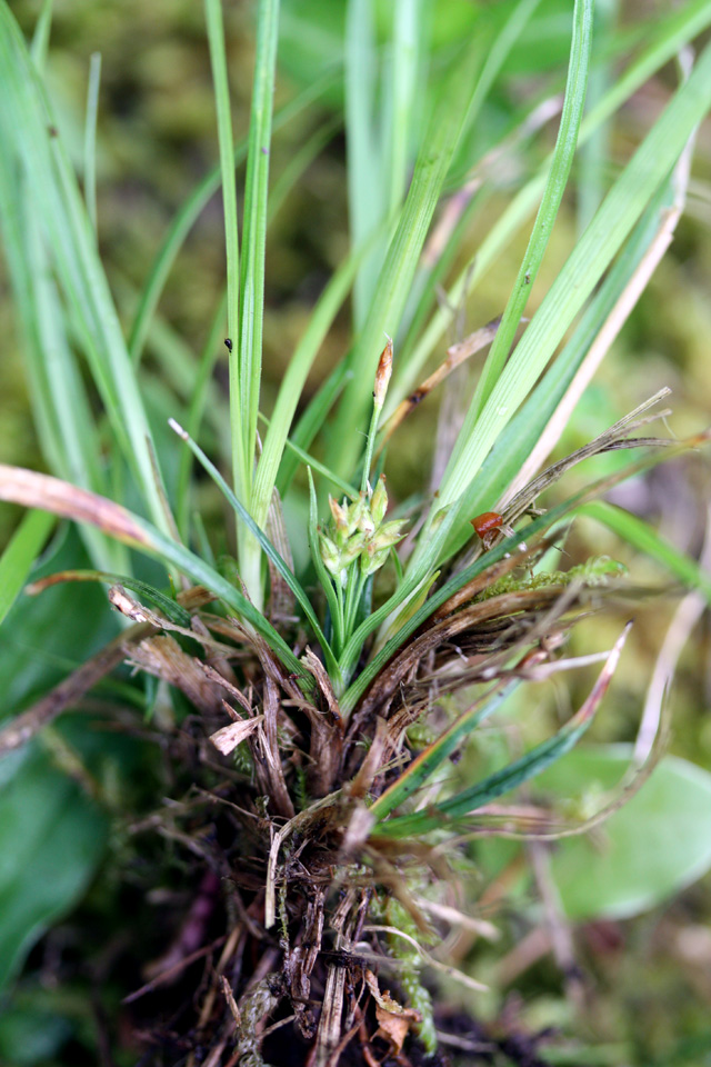 マメスゲは小型のスゲで、雄小穂は直立して柄が長い。雌小穂は柄が短く根生することで、他のアオスゲ類とは区別できる