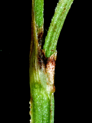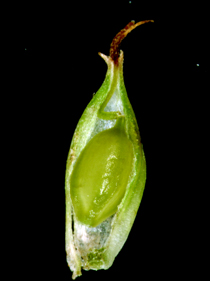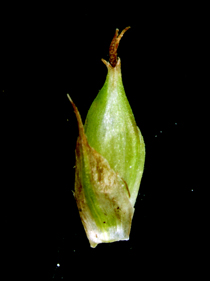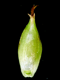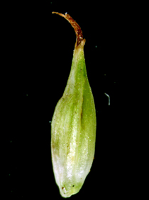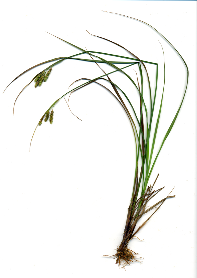 【同定のカギ】亜高山帯の岩場に生える多年草。葉の裏面には乳頭状突起を密布。基部の鞘は、赤褐色。頂小穂は雌雄性で、基部に雄花がある。雌小穂には柄があり、やや下垂する。果胞は、雌鱗片とほぼ同長、5−6の細脈、無毛、口部は鋭2歯。柱頭は3岐。Carex peiktusani Kom. 【国内分布】南アルプス。【国外分布】朝鮮、中国東北地方。 【ノート】分布が不明であったが、佐藤孝敏氏により南アルプスの亜高山帯で再発見された。マンシュウクロカワズスゲは、ヒラギシスゲとは鱗片が淡褐色、果胞の口部が鋭2歯(ヒラギシスゲは鱗片が黒紫色、果胞の口部は全縁)となることで異なる。