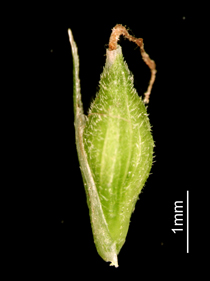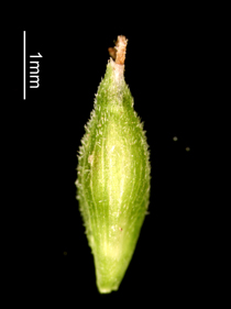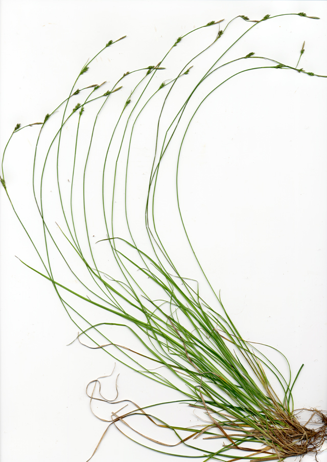 【同定のカギ】乾いた路傍や林床に生える多年草。苞の葉身は刺状か無い。花序は、雄小穂を頂生し、側生する雌小穂は離れてつき柄は短い。鱗片は、淡緑色で芒は短い。果胞は、雌鱗片より長く、稜間に5−7脈があり、密に短毛があり、上部はしだいに狭まり短嘴となり、口部は平切形。柱頭は3岐。Carex horikawae K.Okamoto 【国内分布】本州(長野県南部、愛知県、瀬戸内海沿岸)、四国(瀬戸内海沿岸)、九州(宮崎県)。日本固有。 【ノート】ミセンアオスゲは、アオスゲやイトアオスゲと似るが、雌小穂が互いに離れてつき、雄小穂は柄があり、苞の葉身がほとんどないことで区別できる。