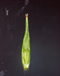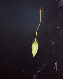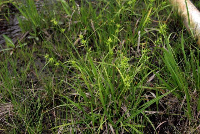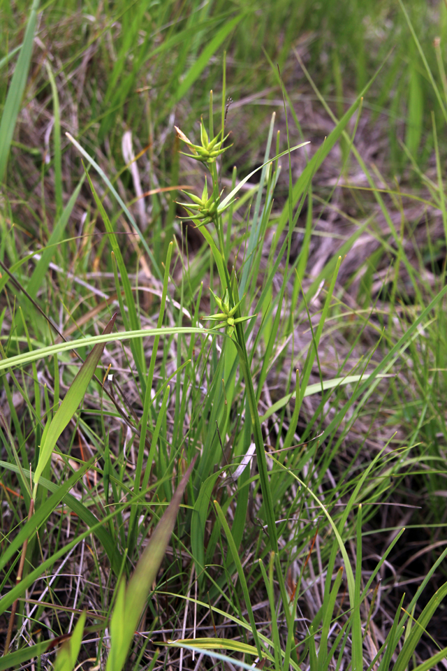 【同定のカギ】湿原の周辺に生える多年草。小穂は、花茎の上部に集まる。頂小穂は雄性で直下の雌小穂に続く。鱗片は淡褐色で中肋部分は緑色。果胞は、熟すと開出し、雌鱗片より長く、稜間に多数脈があり、無毛、長嘴で縁に細鋸歯があり、黄緑色、口部は2歯、基部は肥厚する。柱頭は3岐。Carex dolichocarpa C.A.Mey. ex V.I.Krecz. 【国内分布】北海道、本州(中部地方以北、岡山県)、九州(大分県)。【国外分布】千島、カムチャツカ。 【ノート】ミタケスゲは、北海道や中部地方以北に多く見られるが、中国地方や九州にも隔離分布する。