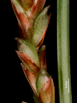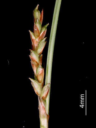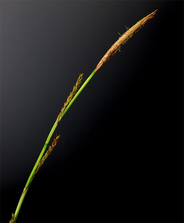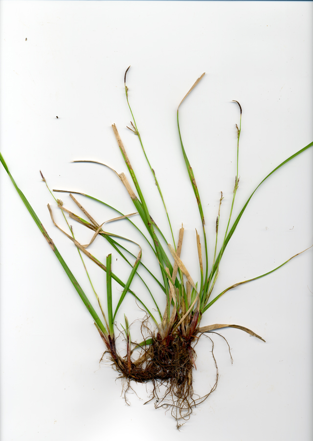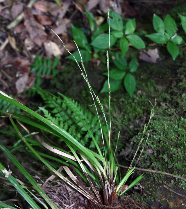 Carex multifolia Ohwi 【国内分布】北海道、本州、四国、九州、伊豆諸島(利島)。日本固有。 【同定のカギ】山地の林床や林縁に多い多年草で、叢生し、匐枝はない。基部の鞘は、光沢があり紫褐色。頂小穂は細く線柱形、雌小穂は果胞を疎らに付ける。鱗片は淡褐色。果胞は、雌鱗片より長く、稜間に7−9脈があり、疎らに短毛があり、上部は急に狭まってやや長い嘴となり、口部は凹形。柱頭は3岐。 【ノート】ミヤマカンスゲは、小穂や有花茎は細い。基部の鞘は、赤みがかった鮮やかな紫色で、ほとんど細裂しないことでダイセンスゲと区別できる。また、オクノカンスゲやカンスゲとは葉が柔らかく、小穂が細く、基部の鞘の赤身が強いことで区別できる。山地に普通に見られ、大株となり、前年の枯れた葉は白くなりあまり細裂しない。