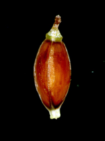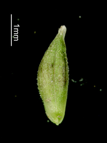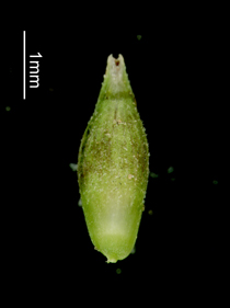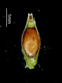 果胞は鱗片より長い 果胞、短毛を疎布 果胞、口部は凹形