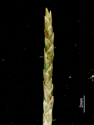モエギスゲ 花序 花茎の上部に集まる、雄小穂を頂生、雌小穂が続く