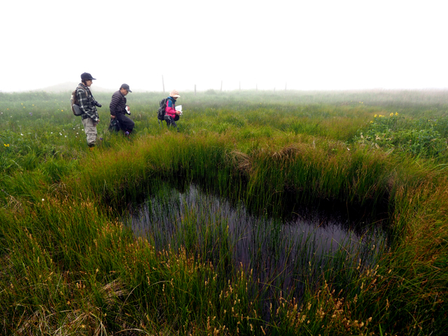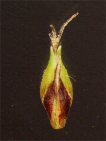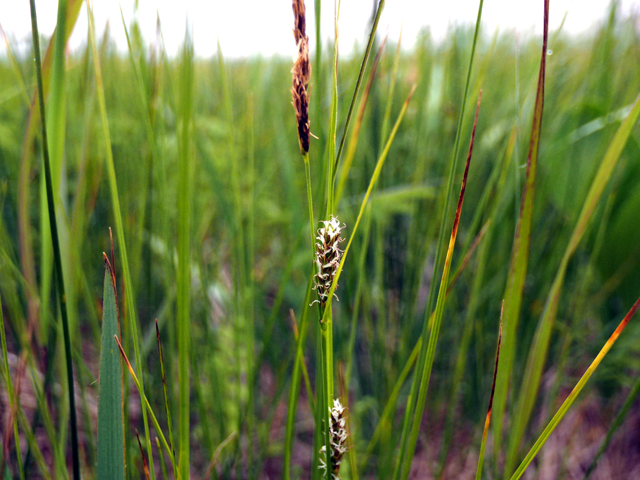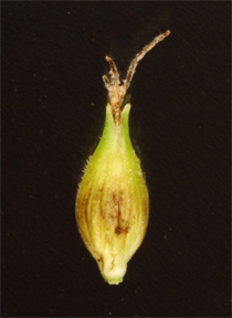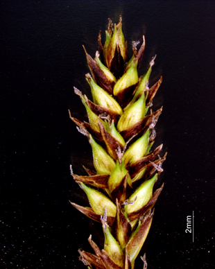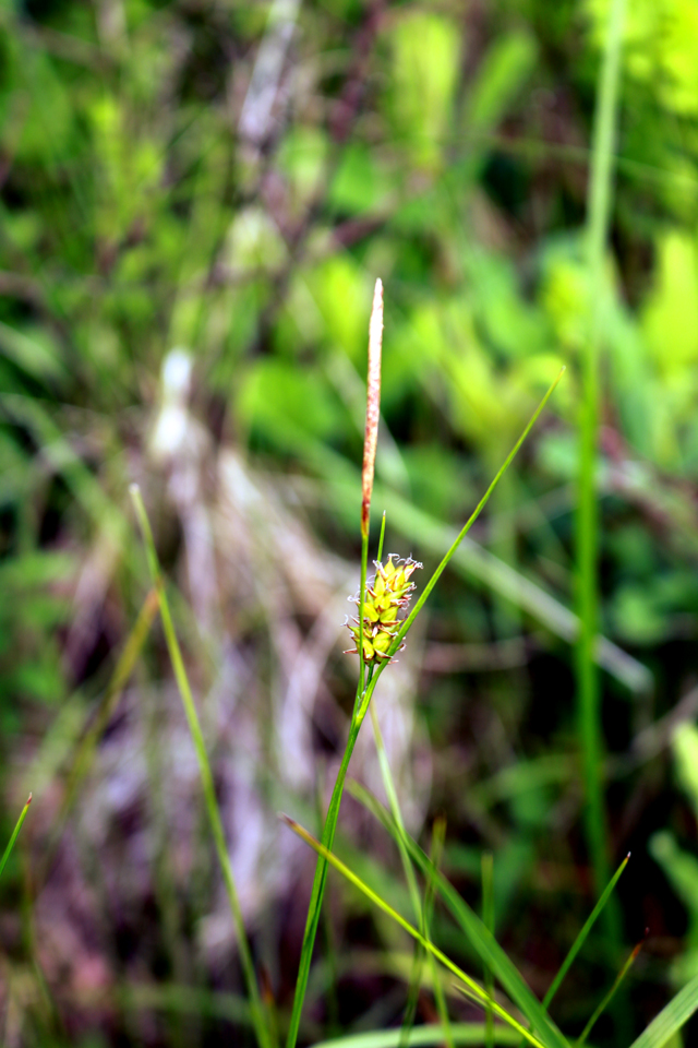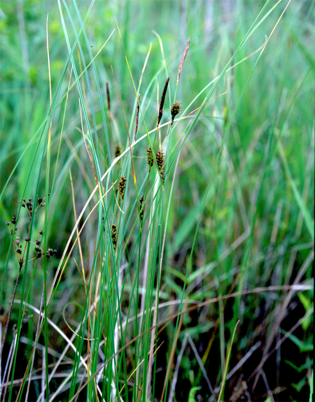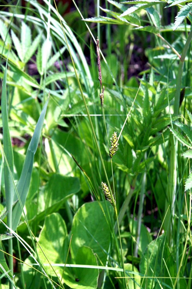 【同定のカギ】湿地や湖沼の縁に生え、長い根茎がある。有花茎は、断面が3稜形で硬く、上部はざらつく。苞の前葉は長い。1〜3個の線形の雄小穂を頂生、雌小穂は離れてつき無柄。鱗片は黒褐色。果胞は、雌鱗片とほぼ同長またはやや長く、脈があり、疎らに有毛、短嘴、光沢があり、口部は鋭2歯となる。柱頭は3岐。Carex lasiocarpa Ehrh. var. occultans (Franch.) Kuk. 【国内分布】北海道、本州(中部・関東地方以北)。【国外分布】サハリン、千島、朝鮮、東シベリア。種としてはヨーロッパと北アメリカに広く分布。 【ノート】ムジナスゲは、有花茎が3稜形で硬く、果苞の嘴が短いことで、ビロードスゲやスナジスゲと異なる。