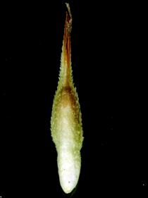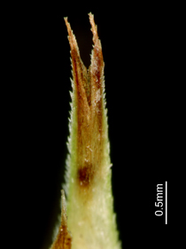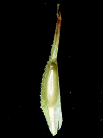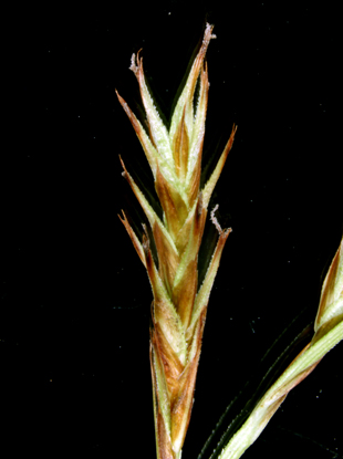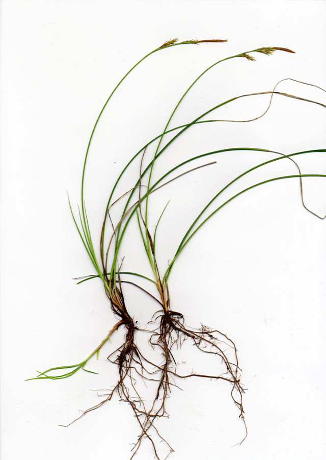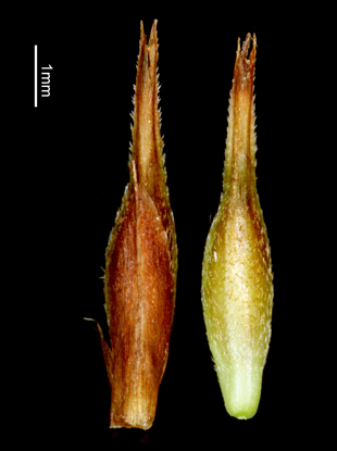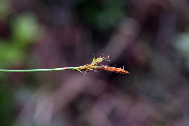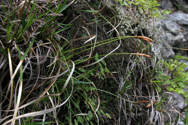 【同定のカギ】山地の岩場に生え、短い根茎がある。葉は、ざらつき硬質。棍棒状の雄小穂を頂生、側小穂は雌性で疎らに果胞を付ける。果胞、雌鱗片から超出、短毛、縁は細鋸歯状、基部は短柄、長嘴、口部は鋭2歯。痩果の基部に長い柄がある。柱頭は3岐。Carex odontostoma Kuk. (Carex chrysolepis Franch. et Sav. var. odontostoma (Kuk.) Ohwi) 【国内分布】四国、九州。【国外分布】台湾。 【ノート】タイプロカリティは長崎県対馬の白嶽。山地に隔離分布する。ミヤマイワスゲは、コイワカンスゲに似るが果胞が長い。