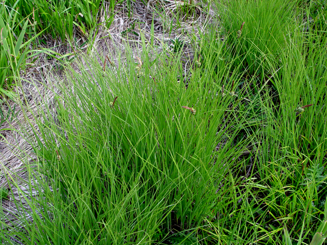 【同定のカギ】泥炭湿地に生える多年草で、大株となり、根茎は剛強で谷地坊主を作る。葉は、粉緑色でざらつく。小穂は、頂部に接近して付く。鱗片は、濃紫褐色。果胞は、雌鱗片と同長またはやや長く、4−5細脈、無毛、上部は急に狭まり短嘴となり、乳頭状突起を密布し、口部は切形。柱頭は3岐。Carex meyeriana Kunth 【国内分布】本州、九州。【国外分布】朝鮮、中国北東部、東シベリア。 【ノート】ヌマクロボスゲは、カブスゲに似て大株となり谷地坊主をつくるが、葉が粉緑色となり果胞が大きく柱頭が3(カブスゲは2)であることで区別できる。タルマイスゲとは根茎がないこと、頂小穂は雄性(タルマイスゲは雌雄性)であることで区別する。