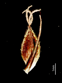 Carex scita Maxim. var. riishirensis Kukenth. 【国内分布】北海道の高山草地。【国外分布】サハリン。 【同定のカギ】北海道の高山の湿った草地に生える。有花茎の上部がざらつく。雌小穂は、柄が長く下垂する。鱗片は濃赤紫色〜濃赤褐色。果胞は、雌鱗片よりやや長く、長さ4.5−5 mm、幅1.5−2 mm、稜間に3−4の細脈があり、濃赤紫色の斑点があり、両側に刺毛がある、上部は次第に狭まり短い嘴となり、口部は凹形。柱頭は3岐。 【ノート】リシリスゲは、シコタンスゲに似るが、果胞の長さが短い。また、ミヤマアシボソスゲとは有花茎の上部がざらつくことで区別できる。