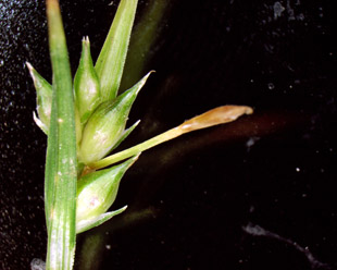 Carex collifera Ohwi 【国内分布】沖縄本島国頭島。日本固有。 【同定のカギ】乾いた林内に生える。有花茎は、10−30 cm、葉より短い、ややざらつく。葉は、硬質でざらつく。果胞は、雌鱗片より長く、長さ5−6 mm、無毛、長嘴、口部は鋭2歯。痩果は、稜の中部が凹む。柱頭は3岐。 【ノート】リュウキュウヒエスゲは、ホウザンスゲに似るが葉の幅が狭く、有花茎は基部に埋もれず、一部は立ち上がることで区別される。サンインヒエスゲとは、匐枝がなく、有花茎は葉より短い。。