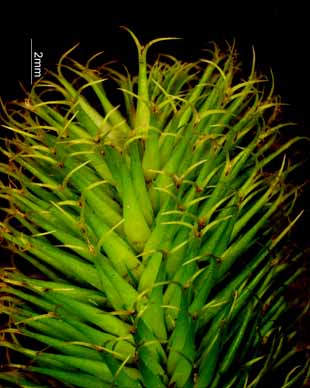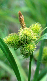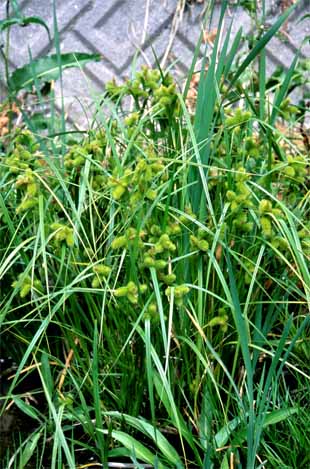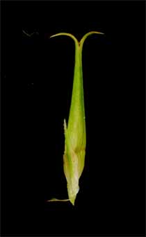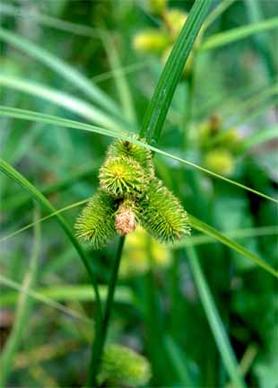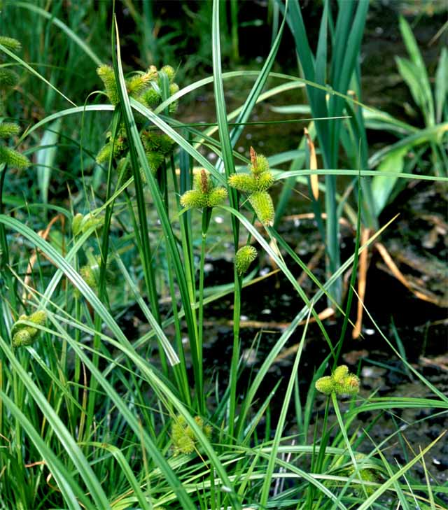 ジョウロウスゲ Carex capricornis Meinsh. ex Maxim. 【国内分布】北海道、本州(関東地方以北)。【国外分布】朝鮮、中国東北、ウスリー。 【同定のカギ】川岸や池畔に生える多年草で、密に叢生する。小穂は有花茎の上部に集まる。頂小穂は雄性、雌小穂は密に果胞を付け,円柱形。果胞は、雌鱗片より長く、披針形、基部に短柄、稜間に多数の脈があり、平滑、長嘴、完熟すると黄色に変色し、口部は深く2裂し裂片が外曲する。柱頭は3岐。 【ノート】ジョウロウスゲの雌小穂は円柱形で大きく、大変目立つ。果胞は細長く、口部は深く2裂していて裂片が外曲する。