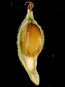 果胞の口部は凹形 果胞と痩果 痩果、基部に長い柄