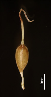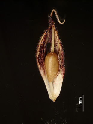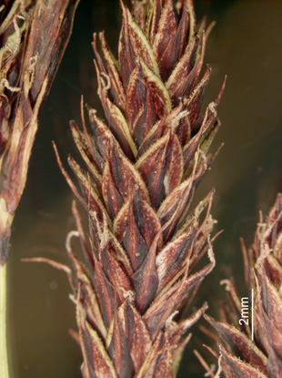 【同定のカギ】2000〜3200mの高山の岩場や草原に見られ、花茎は高さ40〜70cm。頂生する小穂は上部が雌花で、基部に雄花がある。側生する雄小穂は下垂する。鱗片は濃赤紫色で芒がある。果胞は、扁平で縁に剛毛があり、上部は次第に狭まり口部はわずかに2嘴となる。痩果の基部には柄がある。柱頭は3岐。Carex scita Maxim. var. brevisquama (Koidz.) Ohwi 【国内分布】日本海側の高山、月山、燧岳、白山など。日本固有。 【ノート】シロウマスゲは、アシボソスゲほど口部は長くなく芒も短い(3mm以下)。また、ミヤマアシボソスゲは果胞の口部が凹型で嘴がなく、シロウマスゲとは区別される。ダイセンアシボソスゲは果胞が5mm以下で、シロウマスゲの方が長い。