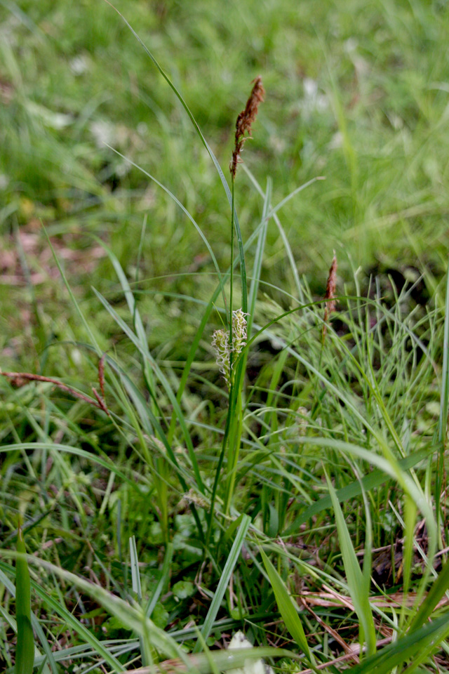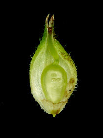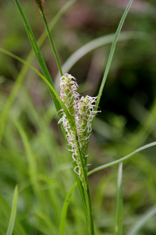 【同定のカギ】河川高水敷に生える多年草。疎に生え、横走する長い根茎がある。雄小穂は2〜5個で頂生し、雌小穂は密着して付く。果胞は、雌鱗片よりやや長く、脈があり、有毛、先端はしだいに狭まり長嘴、緑色、口部は深く2歯となる。柱頭は宿存する傾向がある。柱頭は3岐。Carex glabrescens (Kuk.) Ohwi 【国内分布】本州(岩手県、宮城県、山形県、栃木県、群馬県、茨城県、長野県)。【国外分布】朝鮮、中国東北部。 【ノート】スナジスゲは、ビロードスゲに似るが雌小穂が密着する、果苞の嘴が急に細くならずゆるやかに狭くなる点が異なる。