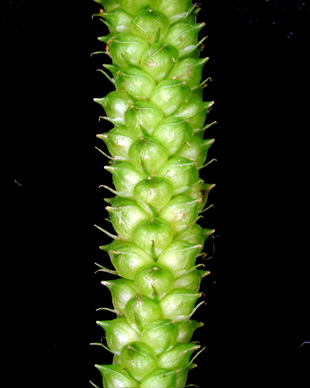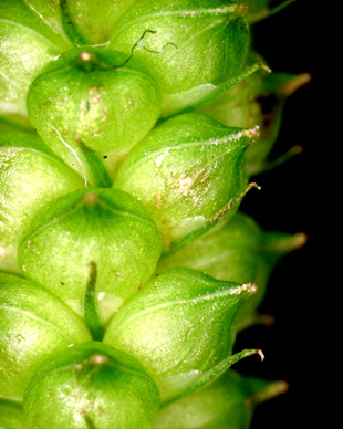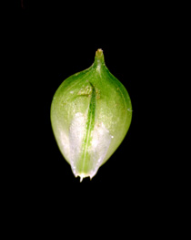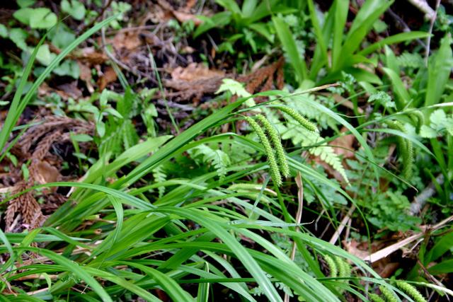 Carex flabellata Lev. et Vant.【国内分布】北海道、本州、四国。日本固有。 【同定のカギ】山道脇の水湿のある所に生え、大株となる。葉は、ほぼ平滑、裏面に乳頭状突起があり粉白色。有花茎は、平滑。雌小穂は、柄が長く下垂する。果胞は、雌鱗片より長く、稜間に3−4脈があり、無毛、嘴は短く長さ0.2−0.3 mm、口部は凹形または2小歯。柱頭は2岐。 【ノート】ヤマテキリスゲは、テキリスゲやオタルスゲに似るが、有花茎や葉がほぼ平滑であることと果胞に細脈があることで区別される。