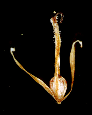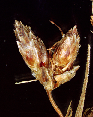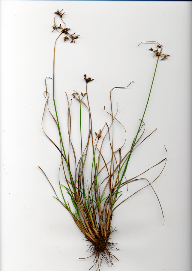 岩場や岩礫地で見られる。植物全体が無毛。有花茎は、直立してかたい。ナガボテンツキより繊細。小穂は、狭長楕円形。痩果に正方形に近い格子紋がある。花柱は、扁平、上部は有毛。柱頭は2岐。