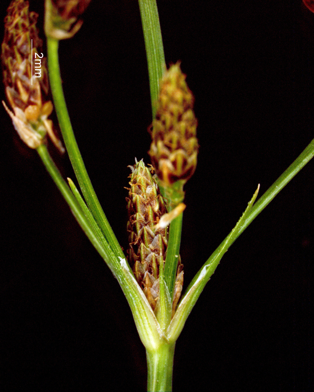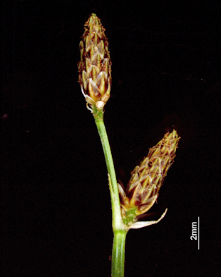 【同定のカギ】日当たりの良い湿地に生える1年草、植物体は無毛。有花茎は、高さ15−40 cm。花序は、散房状。小穂は、長さ約4 mm、褐色、鈍頭。鱗片は、長さ約2 mm、淡褐色、鈍頭。痩果は、完熟すると淡褐色になり、表面に格子紋がある。花柱は、扁平でなく、平滑。柱頭は2岐。【国内分布】本州 (新潟県、関東地方以西)、四国、九州、琉球 (奄美大島)。【国外分布】朝鮮南部、中国。 【ノート】クロテンツキはテンツキに似るが、全体がやや小型で、植物体に毛がなく、花柱は細く平滑で有花茎の基部に無葉身の鞘があることが異なる。