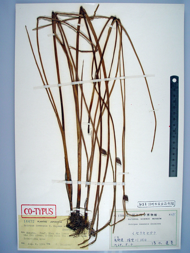【同定のカギ】海水の出入りする河口域や半塩性湿地に生える小形の多年草で、匍匐根茎を長く伸ばす。有花茎は、高さ30−70 cm、横断面は3稜形。苞葉は、上部の1個が直立し、花序より長い。花序は、通常1個の小穂を頂生するが、まれに2−3個の小穂を仮頂生する。鱗片は、長さ4.5−6.5 mm、表面に短毛を密布し、先端は長い芒がある。痩果は、長さ3.5 mm、両面はやや凹む。刺針状花被片は、6本、痩果より短く、下向きにざらつく。柱頭は、2岐 (まれに3岐)。【国内分布】北海道、本州、四国、九州。【国外分布】朝鮮南部、台湾、ロシア極東部、中国−ヨーロッパ。 【ノート】イセウキヤガラは、通常、花序は1個の小穂を頂生する。また、苞葉は直立する。